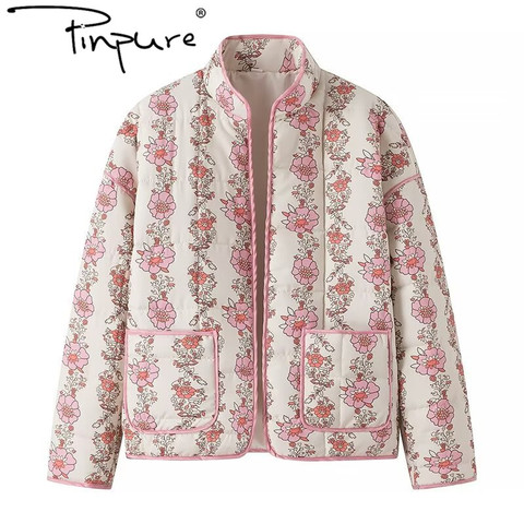 R13780S jaqueta feminina de manga longa com decote em V e bolsos frontais multicoloridos estampados florais moda casual inverno