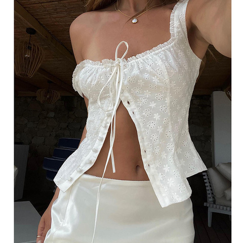 R30127S Branco Elegante Verão Lace Up Sexy Y2K Top Colheita Mulheres Vestuário Moda 2023 Ruffle Sem Mangas Magro Backless Tank Tops